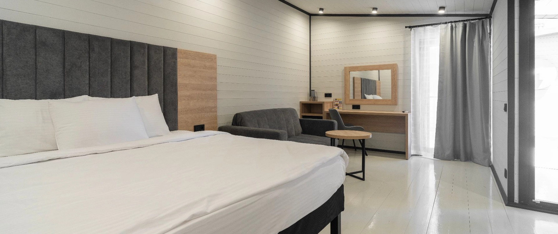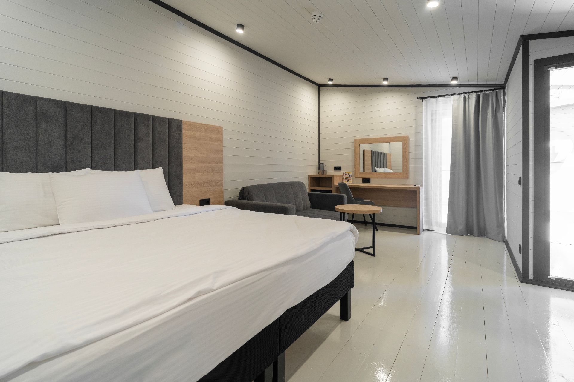 Уютные и стильные домики, созданные специально для комфортного проживания 2-4 человек. В номере: двуспальная кровать, прикроватные тумбы, телевизор, холодильник, кондиционер, прихожая, шкаф для одежды, зеркало, холодильник, набор посуды, сплит-система, телевизор с плоским экраном, бесплатный Wi-Fi, летняя мебель на веранде.