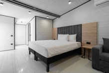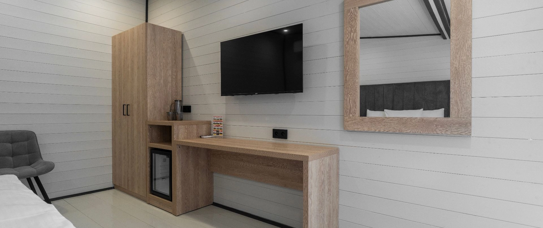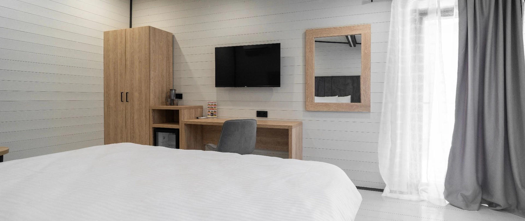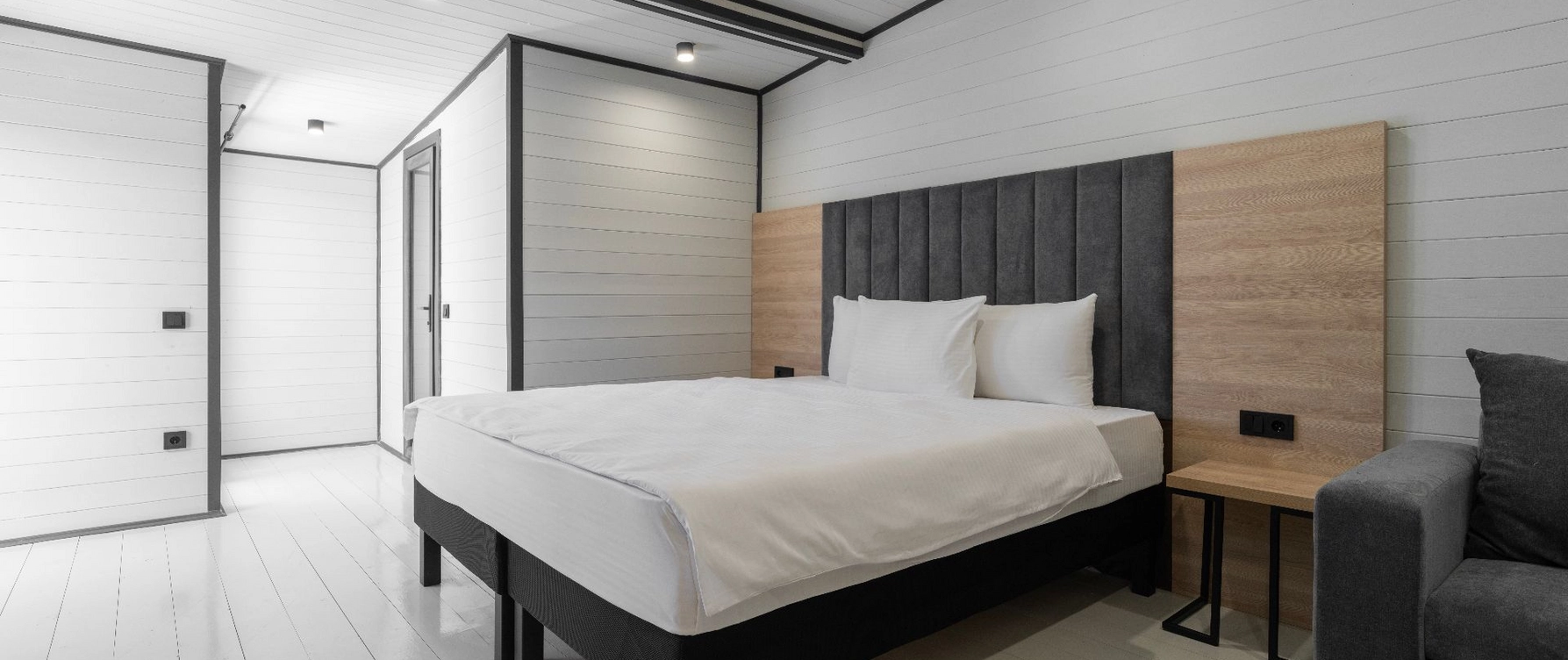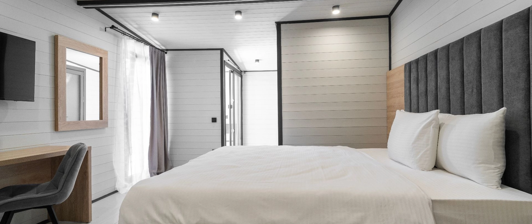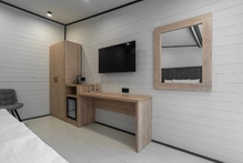 Уютные и стильные домики, созданные специально для комфортного проживания 2-4 человек. В номере: двуспальная кровать, прикроватные тумбы, телевизор, холодильник, кондиционер, прихожая, шкаф для одежды, зеркало, холодильник, набор посуды, сплит-система, телевизор с плоским экраном, бесплатный Wi-Fi, летняя мебель на веранде.
