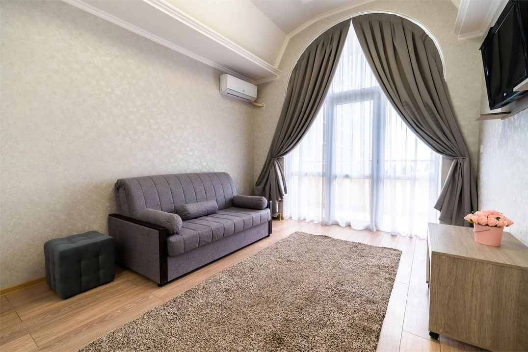 Светлый двухкомнатный номер 40 кв.м. с гостиной и спальней. Вместимость: 4 человек (2 основных и 2 доп.места на диван-кровати). Доп.места оплачиваются отдельно.