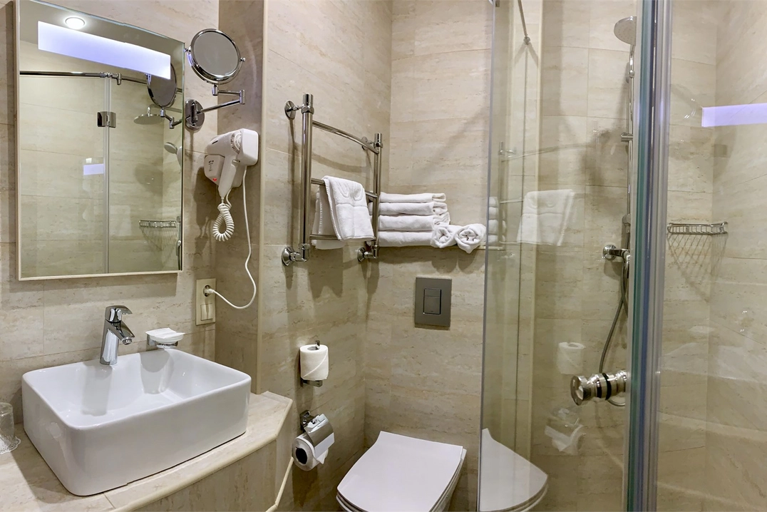 Номер класса "Стандарт с балконом" в основном корпусе и "Стандарт с балконом" (без доп. места) в новом корпусе – красиво обставленные, уютные однокомнатные номера площадью 19-25 кв.м.