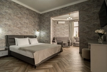 Роскошный номер с одной общей кроватью и с балконом. Максимальное количество гостей до 3 человек. Из номеров открывается вид на море и на город. Площадь номера 24-26 кв.м.