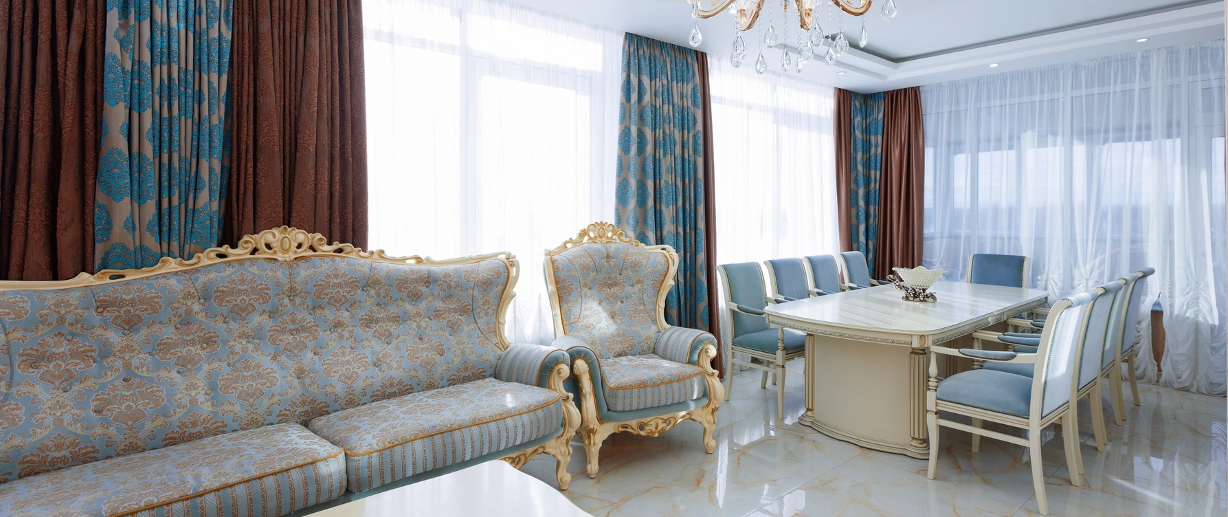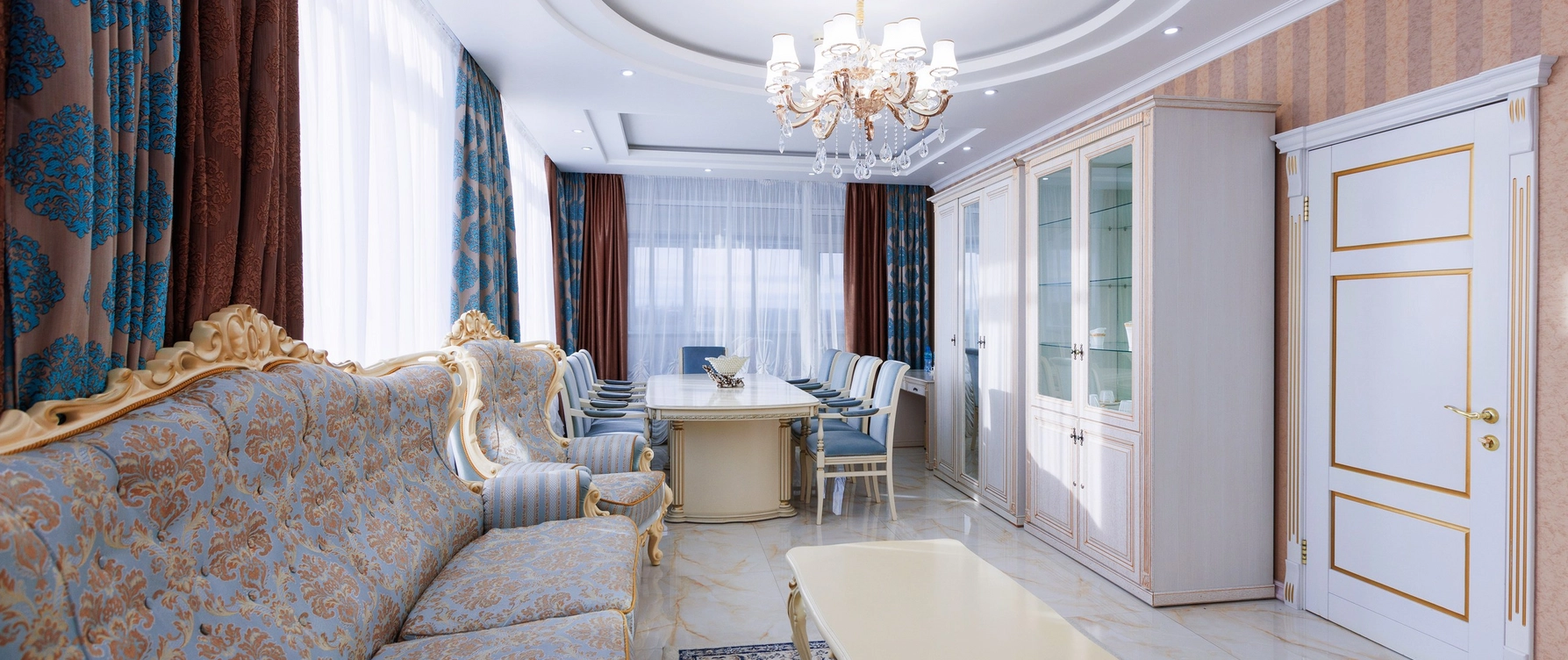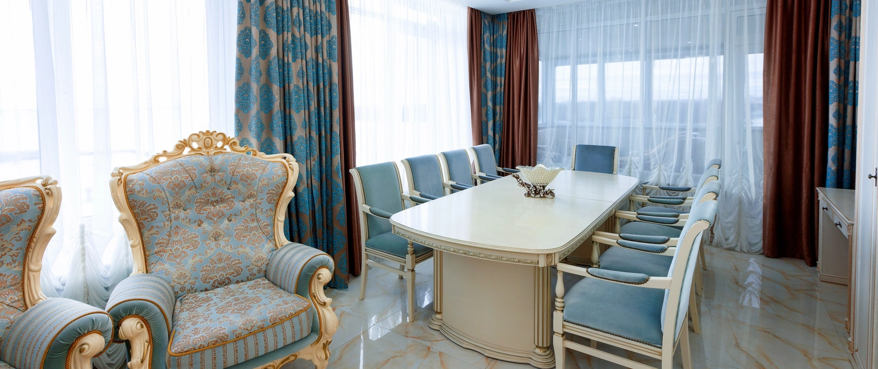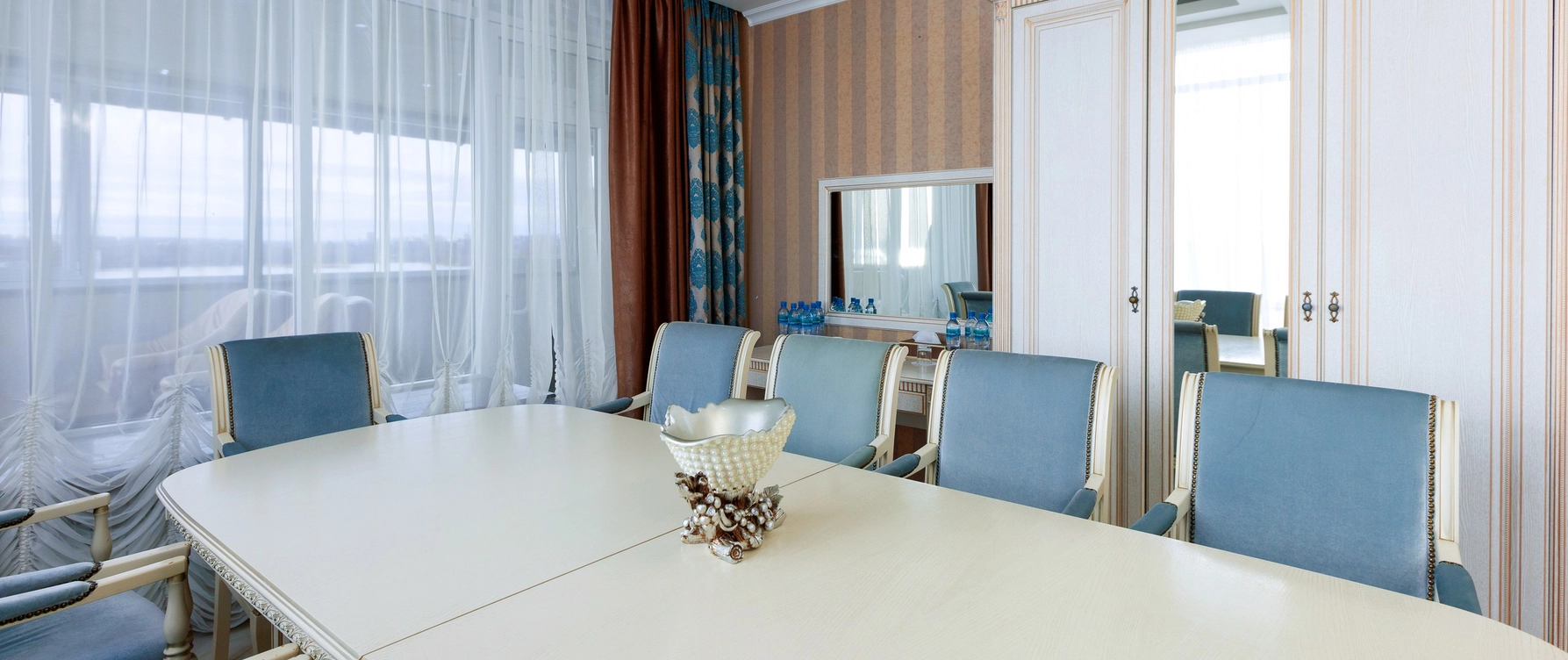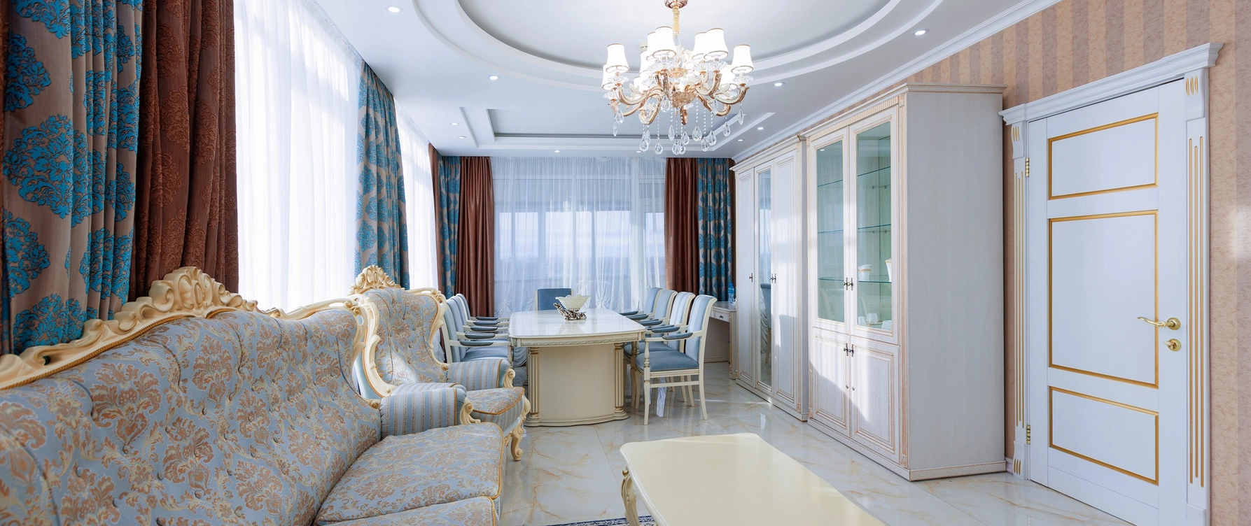 Президентский номер в отеле Грейс Каскад — это роскошное и просторное помещение, включающее несколько комнат: спальню с кроватью, гостиную зону с мягкой мебелью и полностью оборудованную кухню.