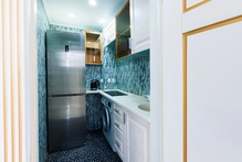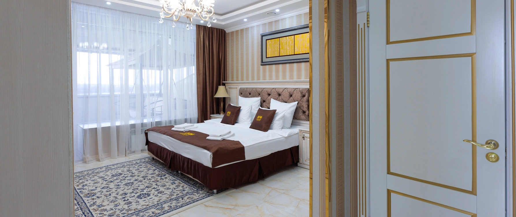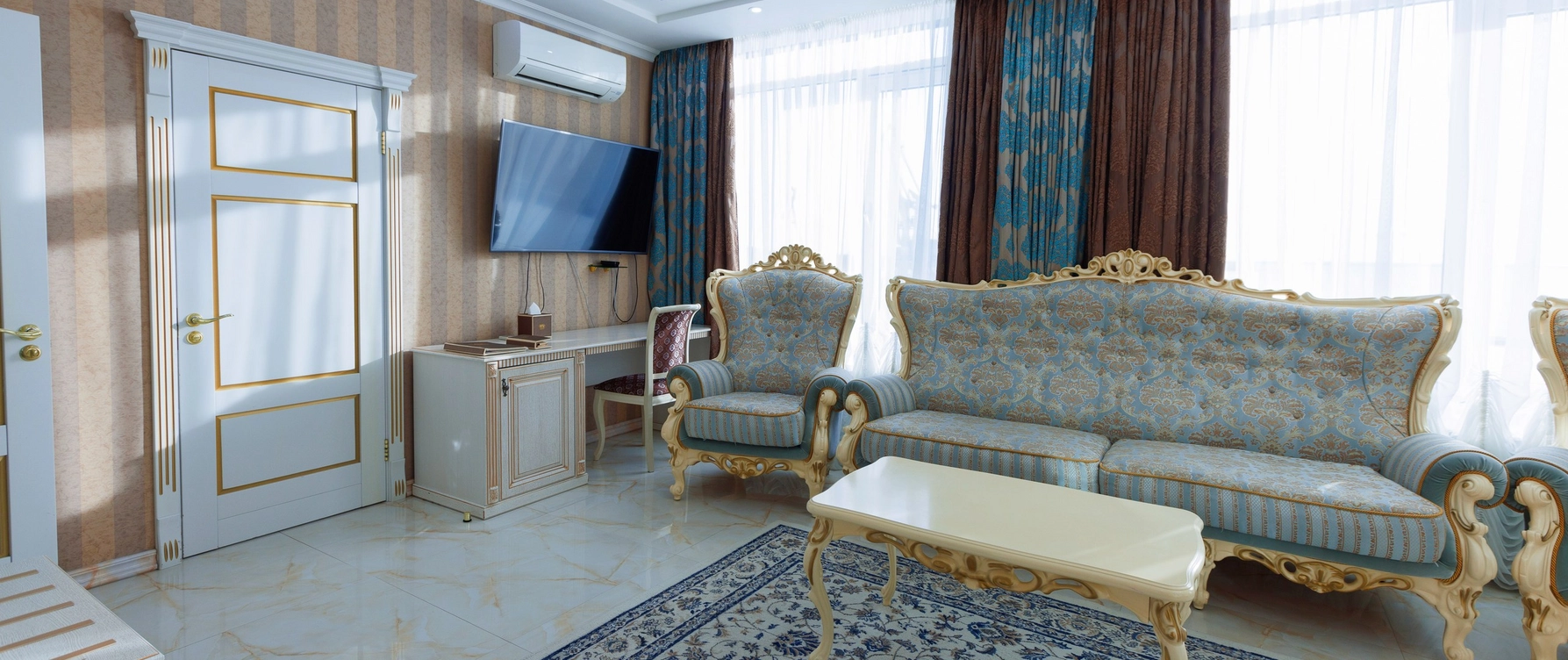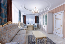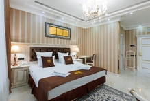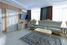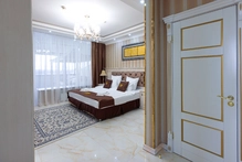 Интерьер выполнен в изысканном стиле с премиальной отделкой и дизайнерской мебелью, создавая атмосферу уюта и изящества. Номер оснащен современными удобствами высокого уровня: климат-контролем, двумя телевизорами, высокоскоростным Wi-Fi, сейфом, телефоном, стиральной машиной, кофемашиной и чайной станцией. В ванной комнате есть душевая кабина, а также предоставляются элитные наборы косметики и банных принадлежностей.