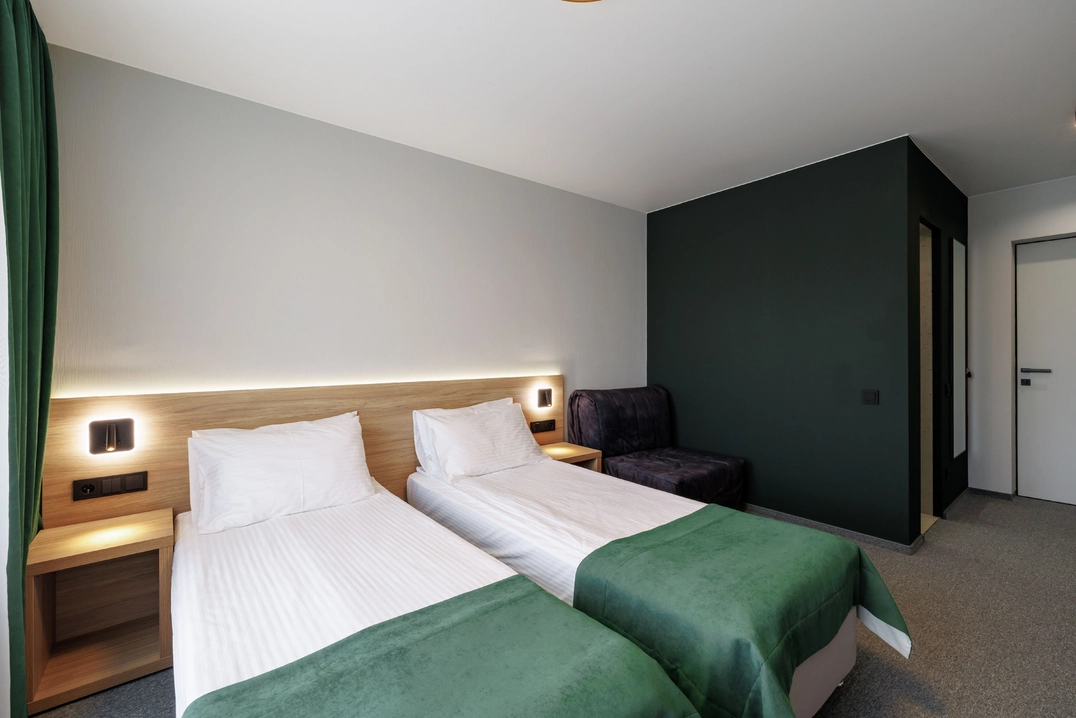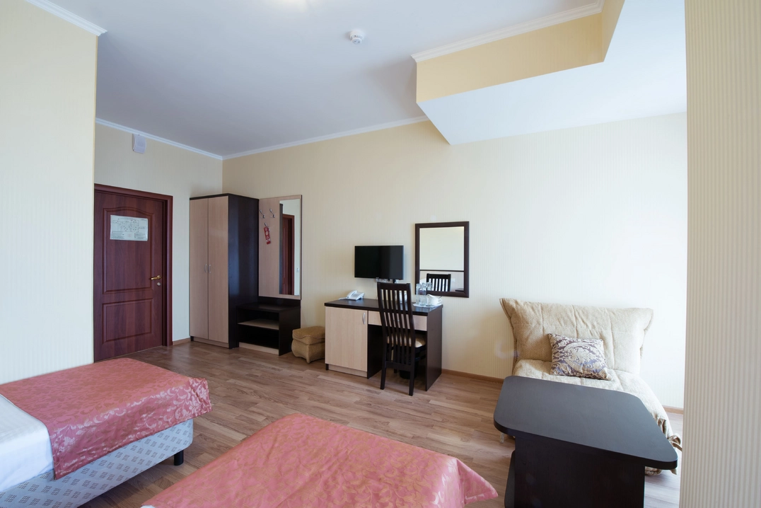 Идеальный выбор для семейного отдыха. Номер "Стандарт улучшенный ББ" предлагает просторное размещение для всей семьи. Удобные кровати, уютная обстановка и продуманное зонирование позволяют каждому члену семьи чувствовать себя как дома. Воспоминания, созданные здесь, останутся с вами надолго.