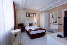 Интерьер светлый и функциональный, оснащен кондиционером, сейфом, телефоном и набором необходимых удобств. Ванная комната оборудована душем, феном, халатами, тапочками и качественными туалетно-косметическими средствами. Это идеальный вариант для деловых путешественников или тех, кто ценит удобство и компактность во время краткосрочного пребывания в отеле.