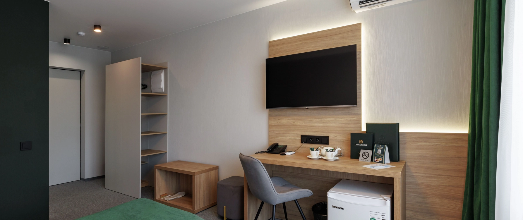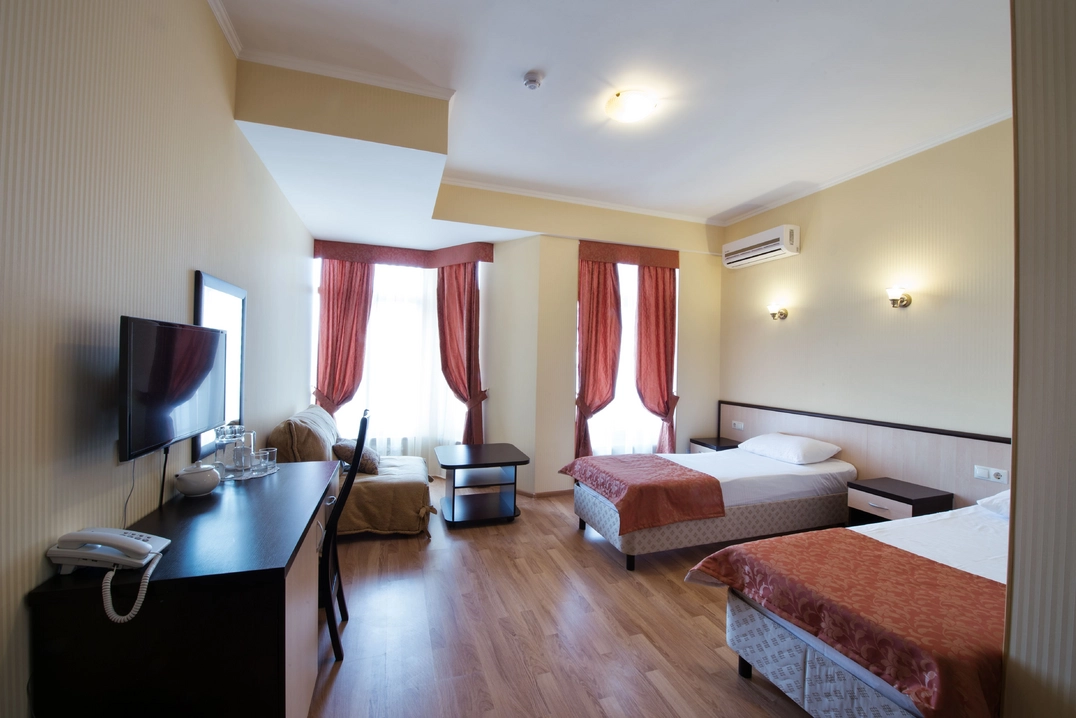 Номер площадью от 16 кв.м. Вместимость до 3 человек. Оплата за третьего гостя взимается отдельно.