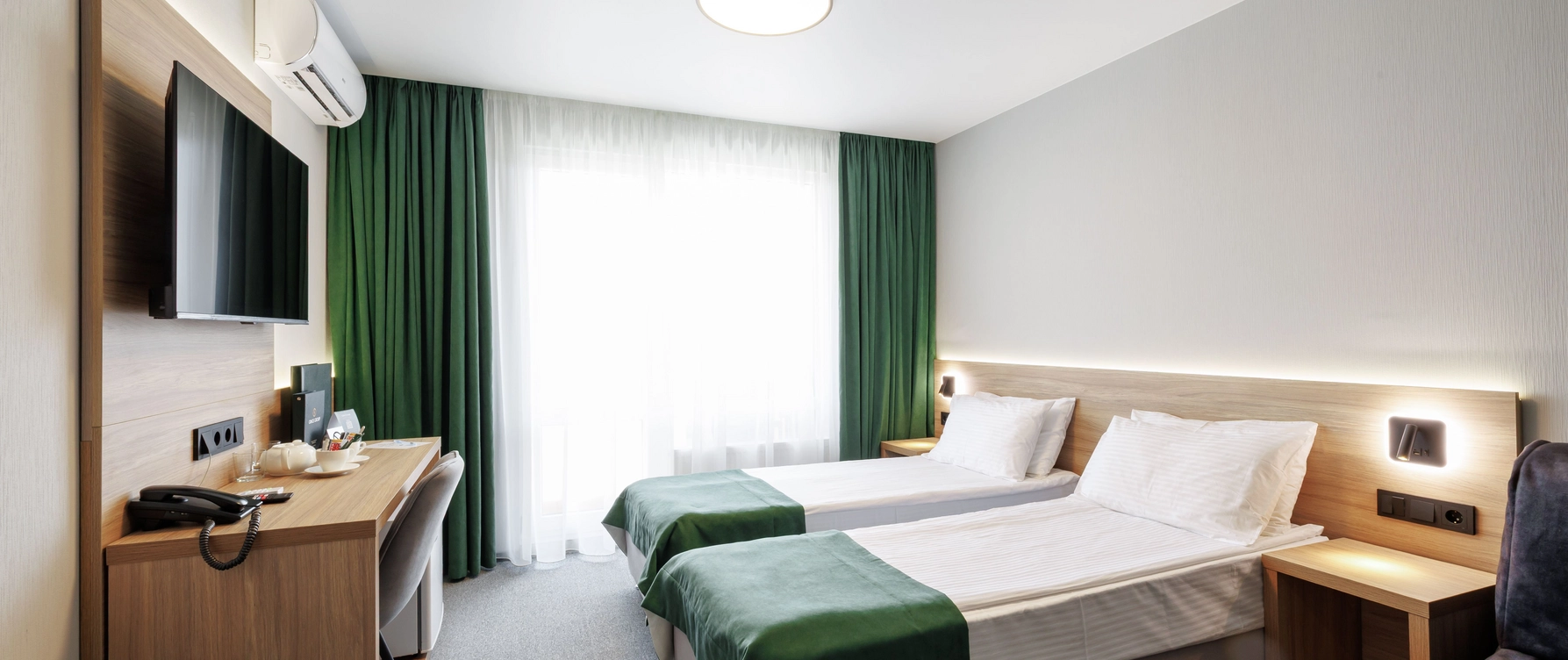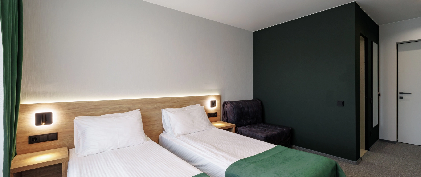 Комфортабельные стандартные номера, светлой и просторной площадью от 16 кв.м. Вместимость до 3 человек.