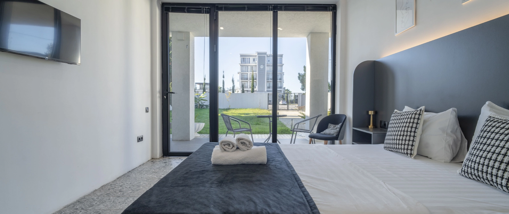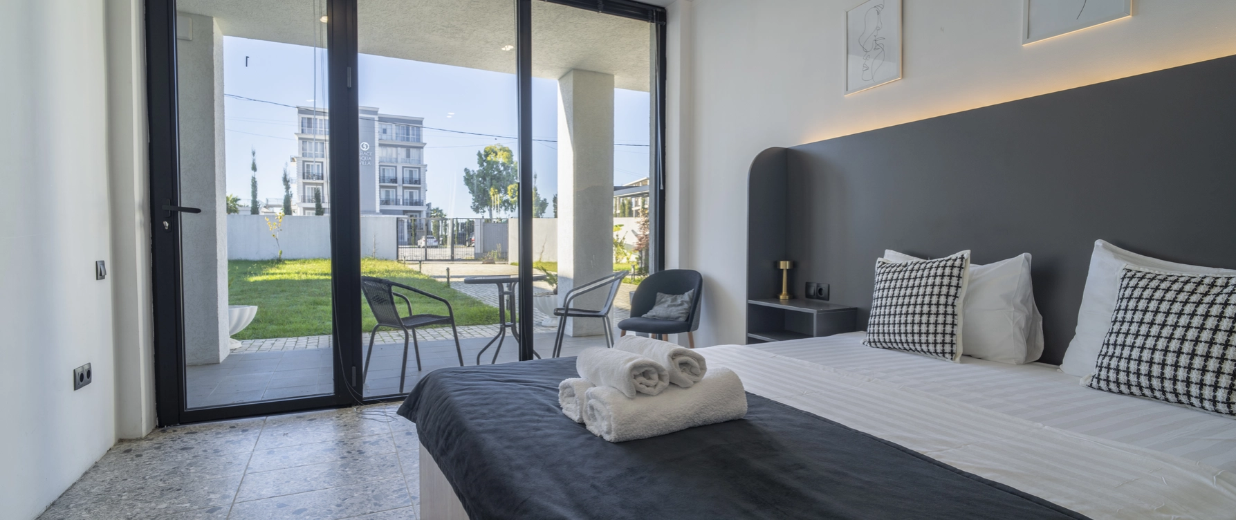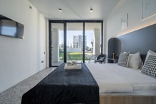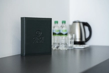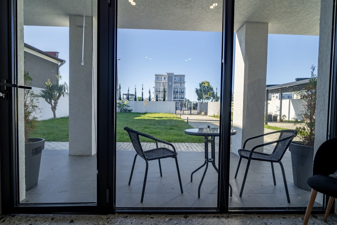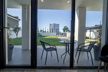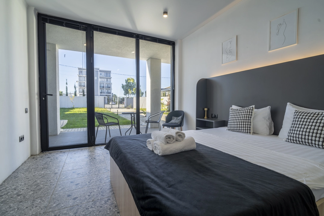Двухместный однокомнатный номер без балкона с двуспальной кроватью. Номера данной категории расположены на 1 этаже, 2 корпуса. В номере: двуспальная кровать, панорамные окна, 2 тумбы, мини-холодильник, рабочий стол и стул, кондиционер, набор для приготовления чая и кофе, бутилированная вода, шкаф для одежды, вешалки, ТВ. В ванной комнате: душ, санузел, раковина, зеркало, банные полотенца, халат и тапочки, гигиенические принадлежности, фен.