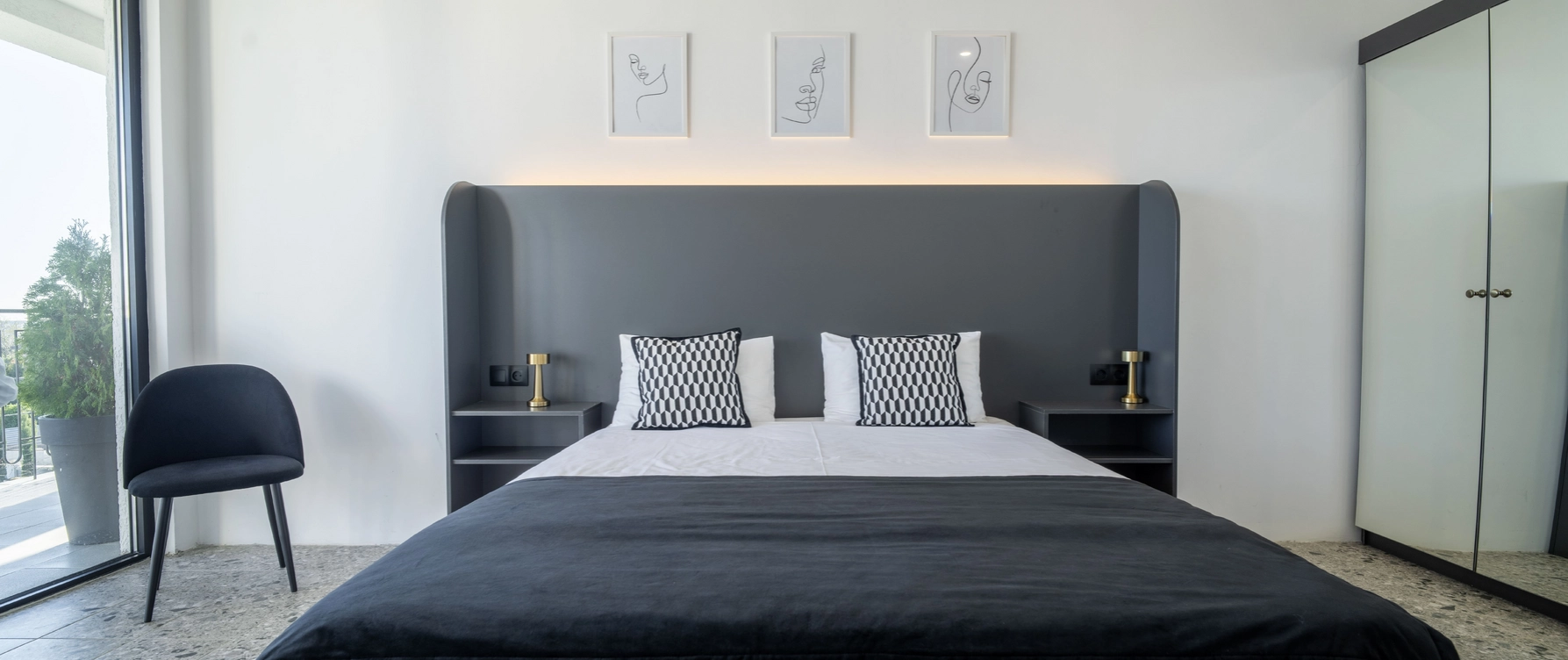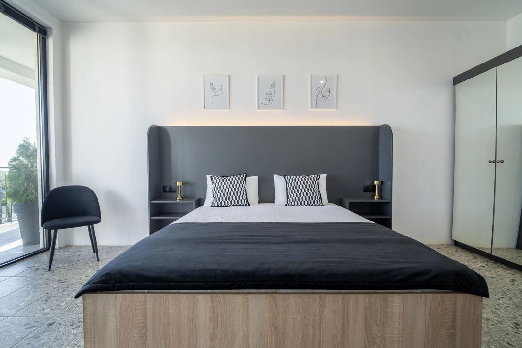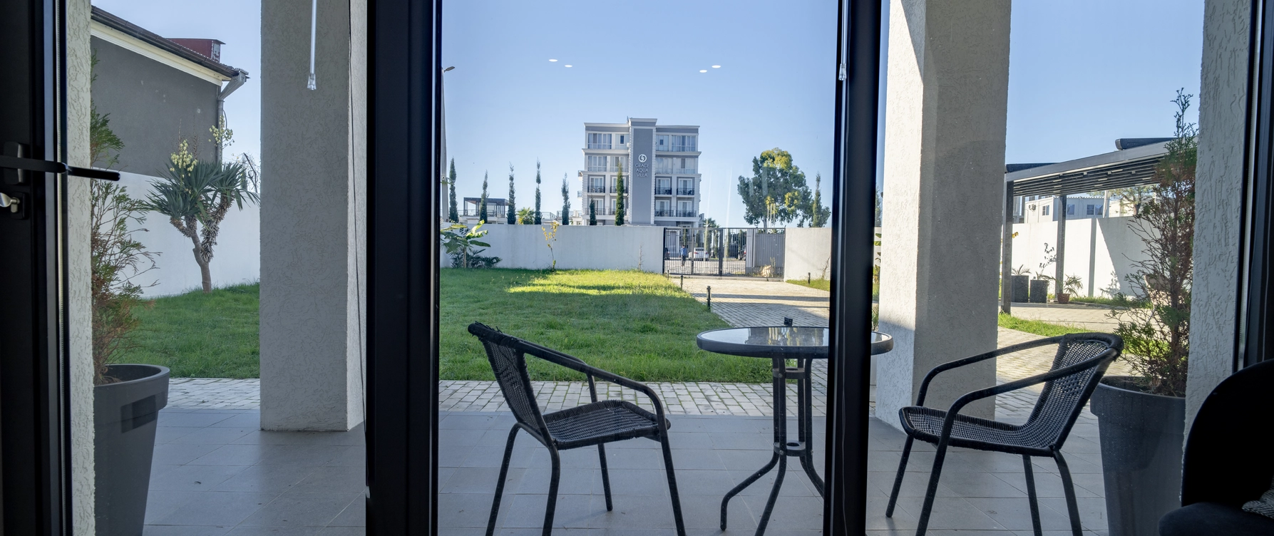 Двухместный однокомнатный номер без балкона с двуспальной кроватью. Номера данной категории расположены на 1 этаже, 2 корпуса. В номере: двуспальная кровать, панорамные окна, 2 тумбы, мини-холодильник, рабочий стол и стул, кондиционер, набор для приготовления чая и кофе, бутилированная вода, шкаф для одежды, вешалки, ТВ. В ванной комнате: душ, санузел, раковина, зеркало, банные полотенца, халат и тапочки, гигиенические принадлежности, фен.