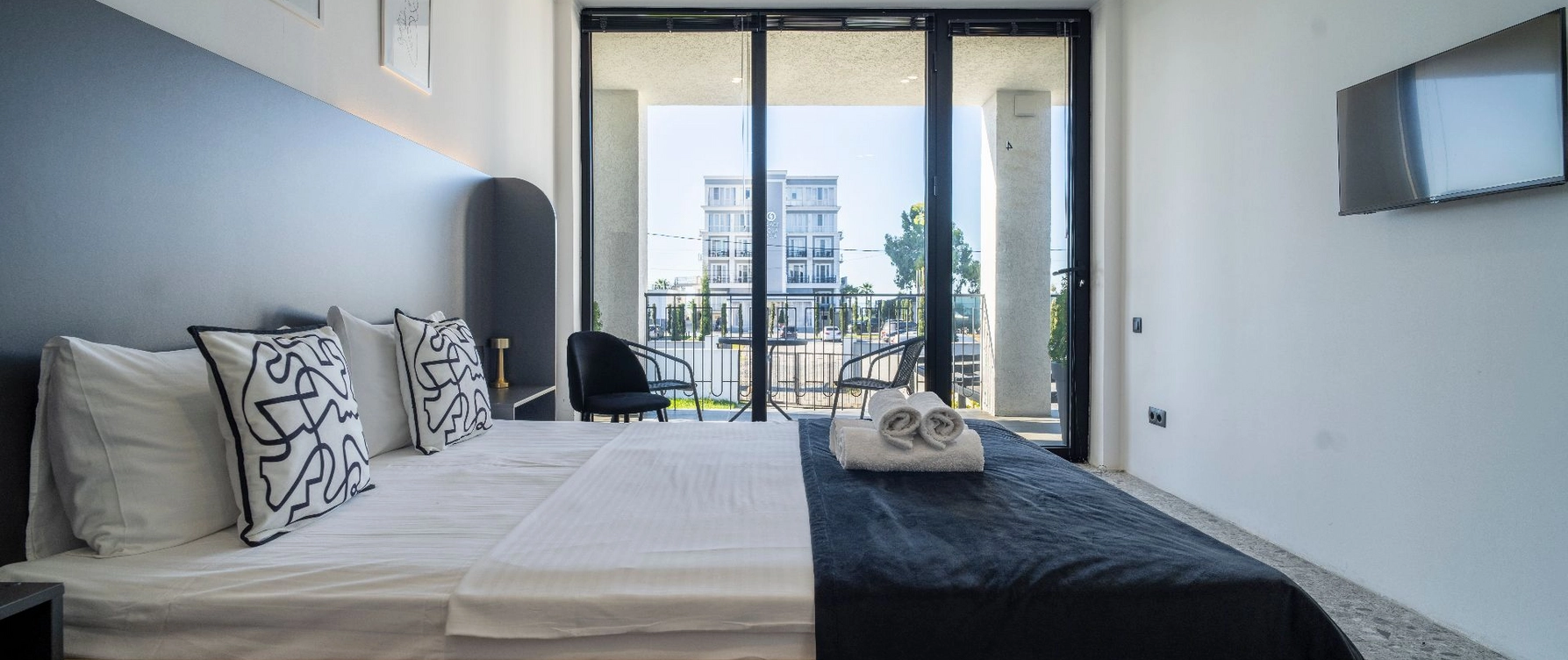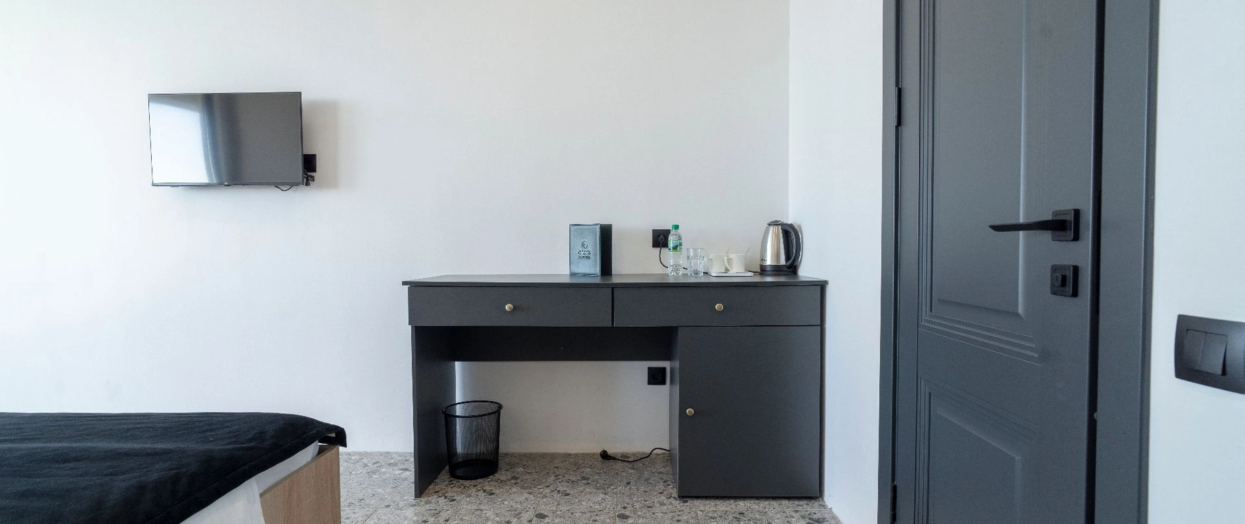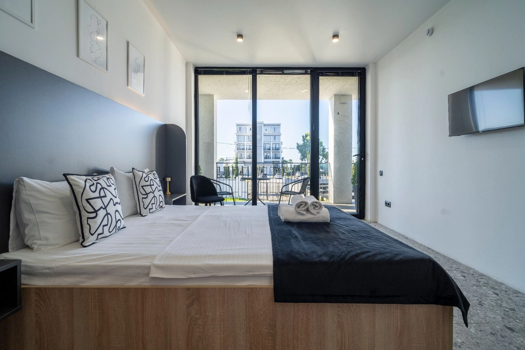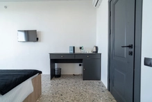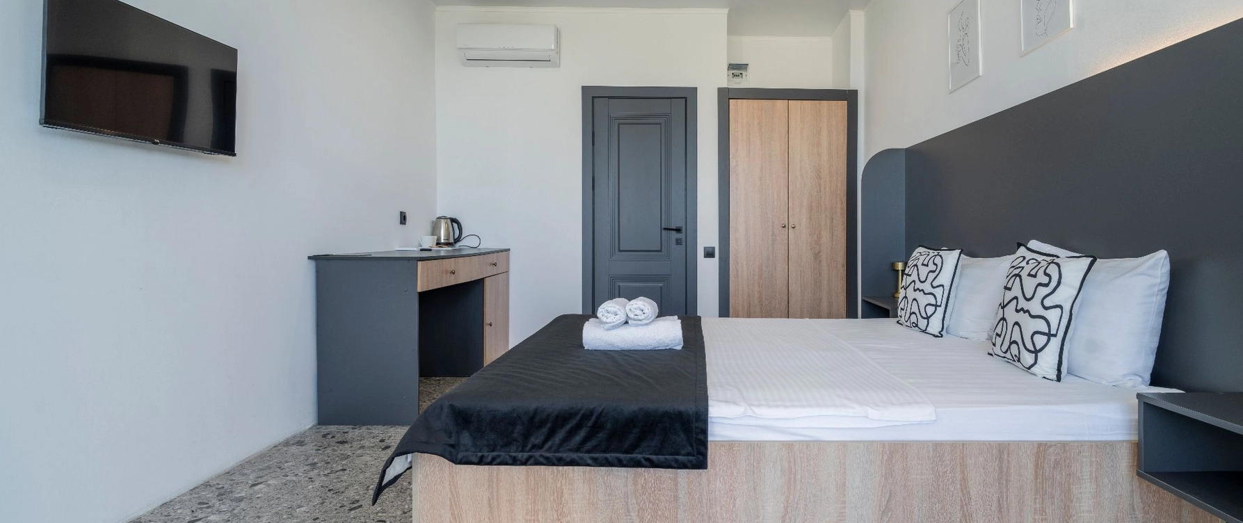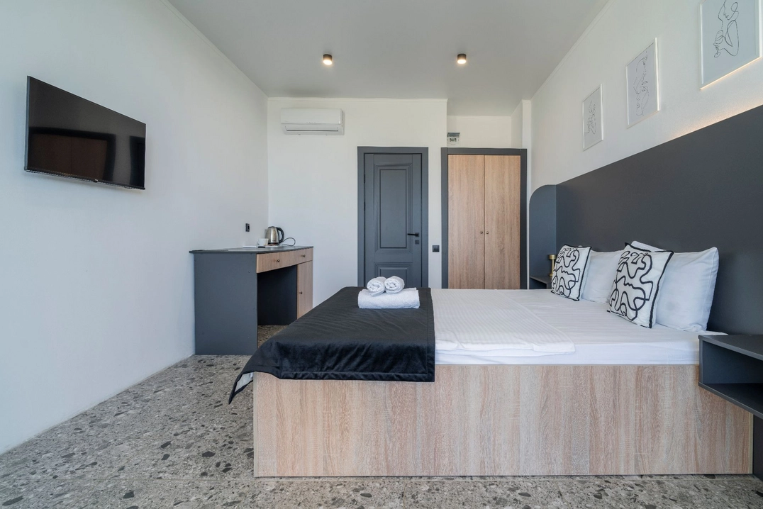 Двухместный однокомнатный номер с балконом и двуспальной кроватью. Номера данной категории расположены во 2 корпусе. В номере: двуспальная кровать, панорамные окна, 2 тумбы, мини-холодильник, набор для приготовления чая и кофе, бутилированная вода, рабочий стол и стул, кондиционер, шкаф для одежды, вешалки, ТВ. В ванной комнате: душ, санузел, раковина, зеркало, банные полотенца, халат и тапочки, гигиенические принадлежности, фен.