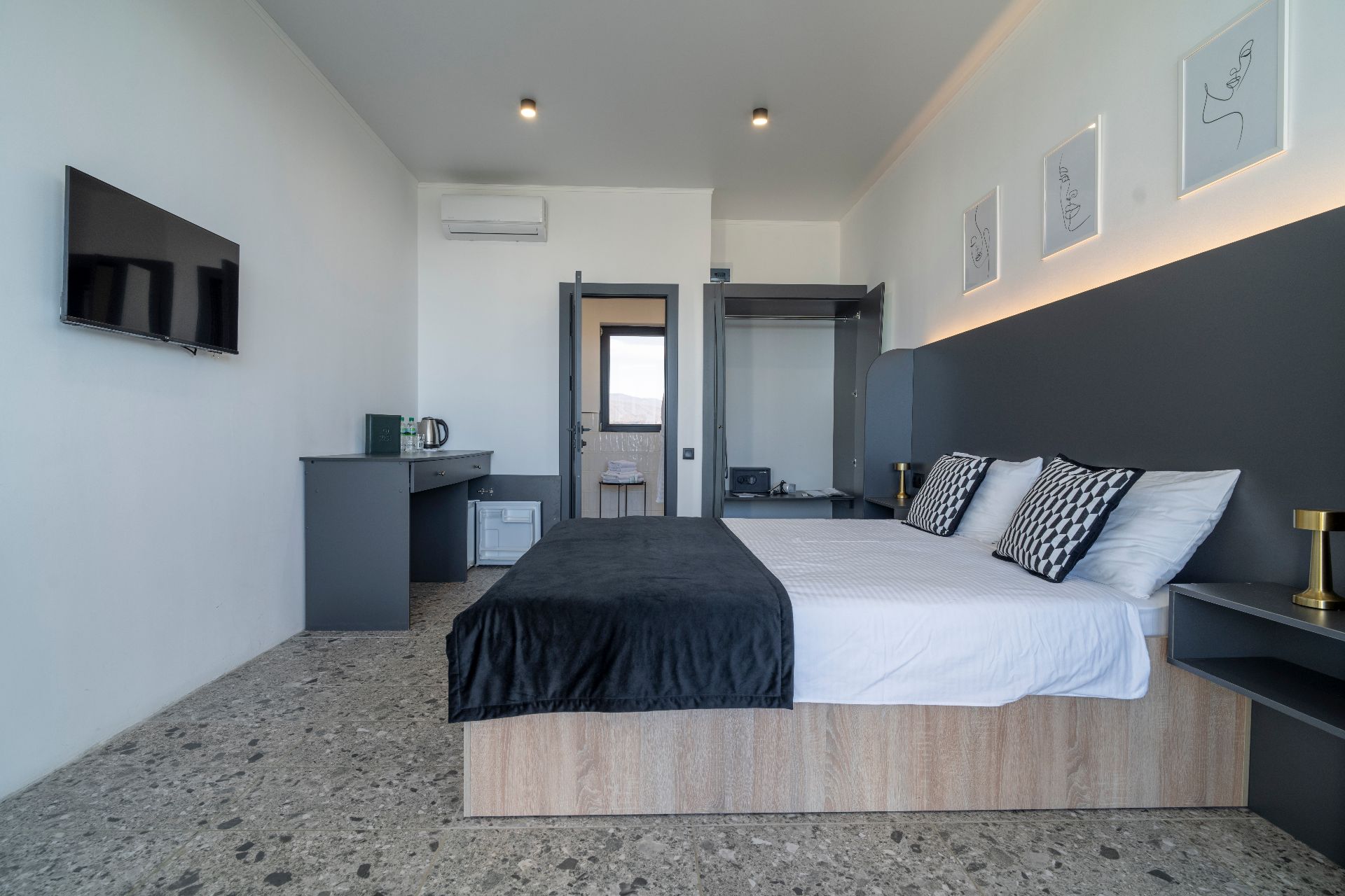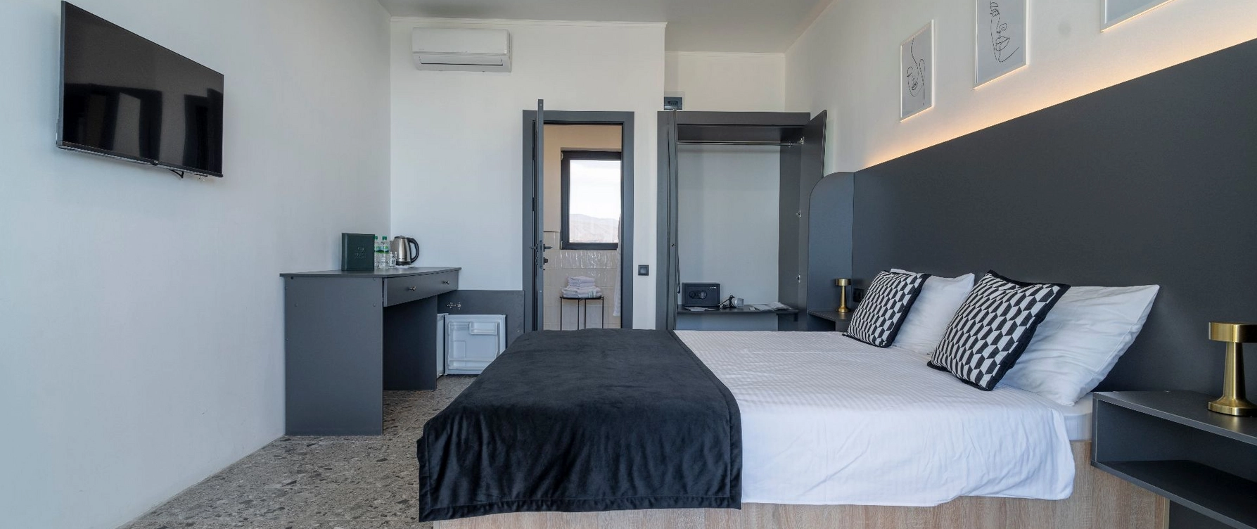 Двухместный номер с балконом и видом на море. Расположен во втором корпусе. В номере: двуспальная кровать и панорамные окна.