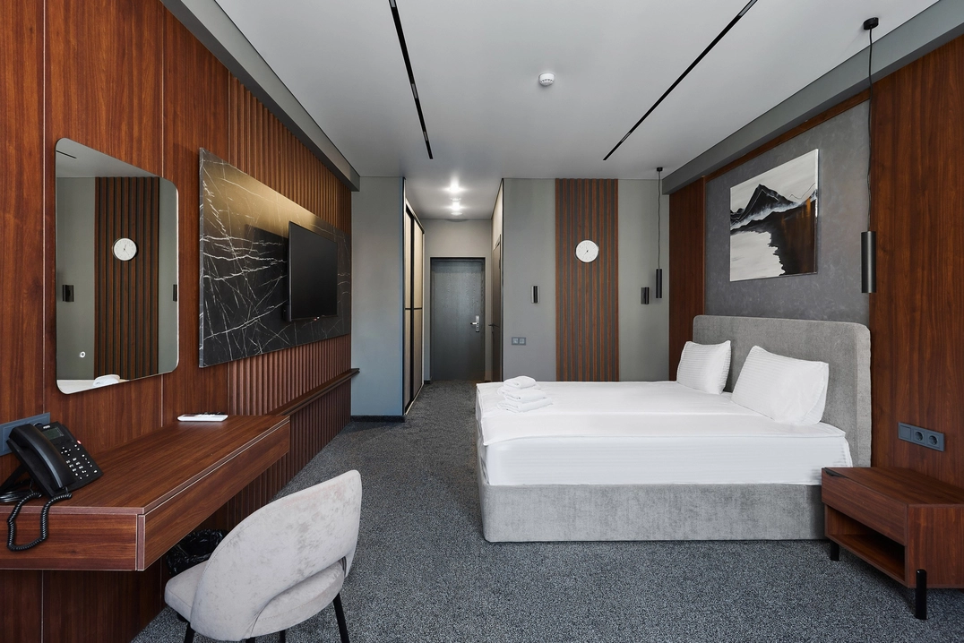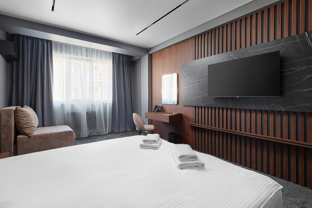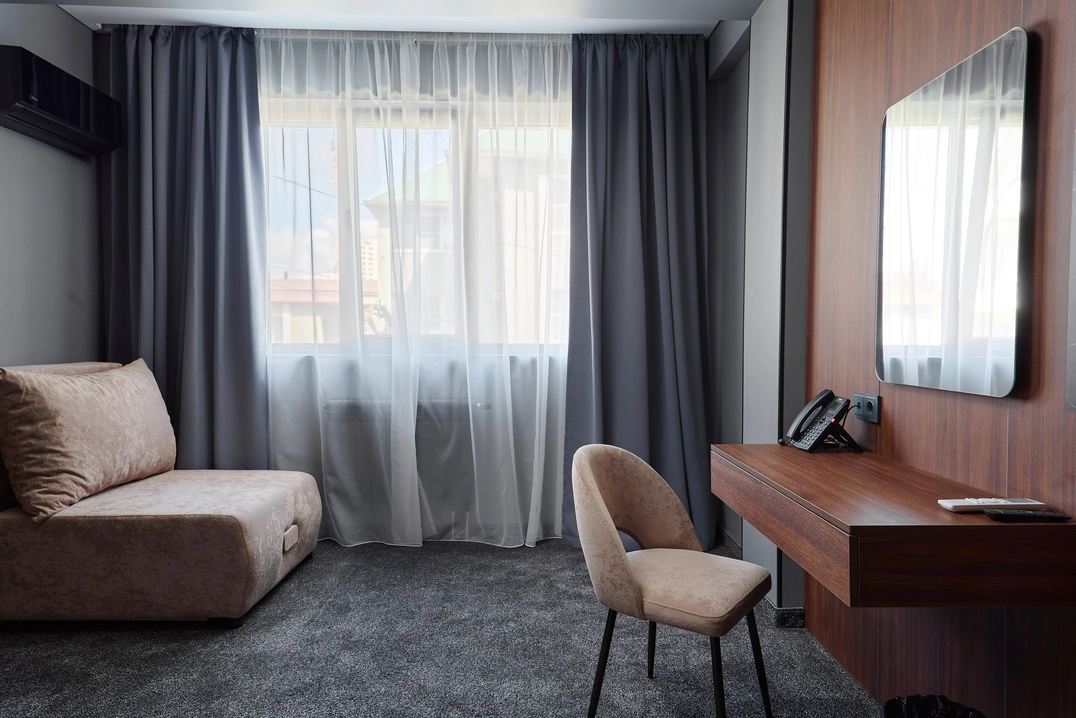 Комфортабельный номер категории "Супериор" без балкона в отеле "Грейс Глобал" идеально подходит для стильного и уютного отдыха. Просторный интерьер, элегантный дизайн и дополнительное спальное место обеспечат максимальное удобство для гостей. Все необходимое для вашего комфорта - от качественного постельного белья до современных удобств - уже ждет вас. Забронируйте и насладитесь уютной атмосферой отеля "Грейс Глобал"!