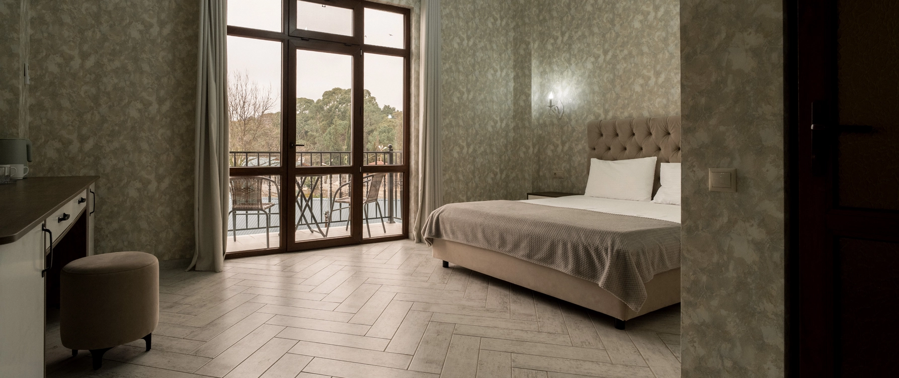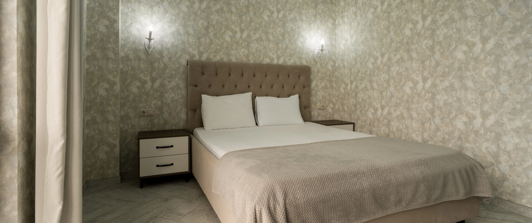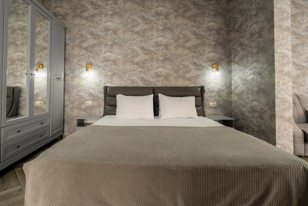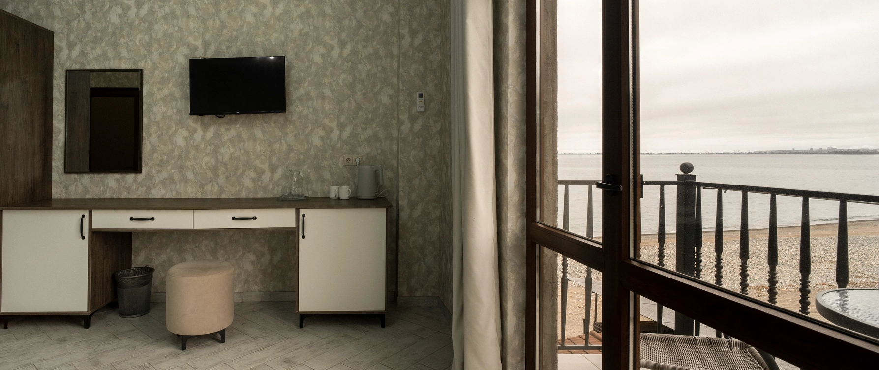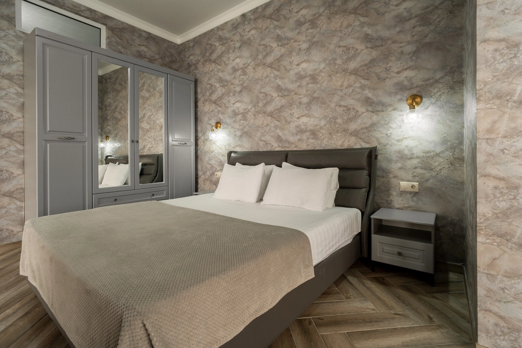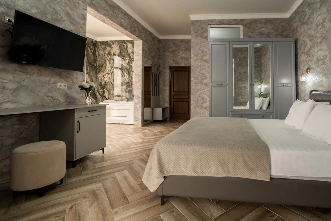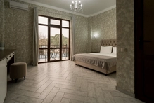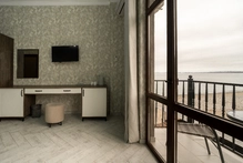 Роскошный номер с одной общей кроватью и с балконом. Максимальное количество гостей до 3 человек. Из номеров открывается вид на море и на город. Площадь номера 24-26 кв.м.